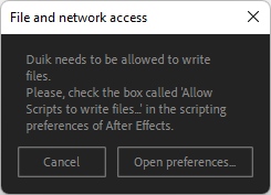 If you see this window, click on Open preferences. This opens After Effects scripting preferences.
