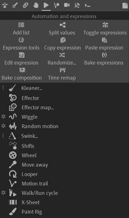 The main tools on the main part of the panel are all the procedural animation tools available in Duik, to help you animate all kind of props and even characters procedurally and automatically.