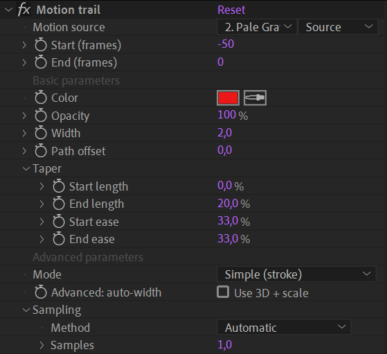 In the basic section, you can change and animate basic appearance settings. Keep in mind that Motion trails are standard shape layers and you can do much more with them by modifying the content by yourself.