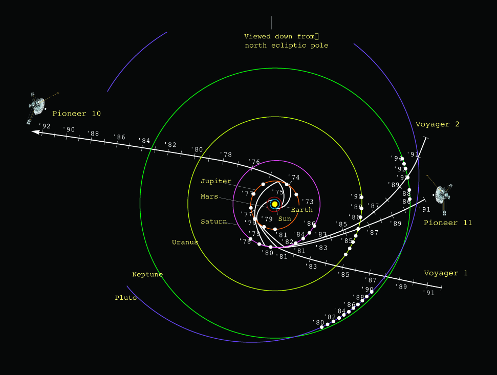 A drawing showing the trajectories of Pioneer 10 and 11 as well as Voyager 1 and 2 on their varied routes out of the Solar System,