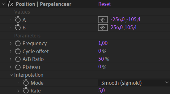 Duik automatically sets the two values A and B to oscillate around the current value of the selected property. You can adjust these values as you wish, or even animate them.