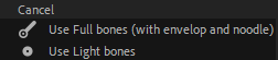 - Full bones, the default, are bones with their envelops and noodles, and all options to control their appearance. They’re displayed as links between the joints.