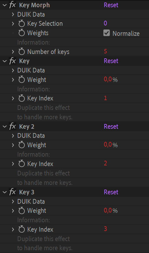 To be able to blend multiple key poses, first adjust these settings on the first Key Morph effect on the layer: