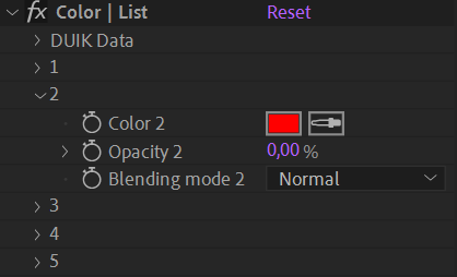 Each value in the list is blended in the previous slot according to the opacity and blending mode.