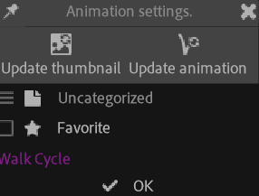 Select an animation and click the edit button to change its thumbnail, its name, replace it by another animation or add it to your favorites.