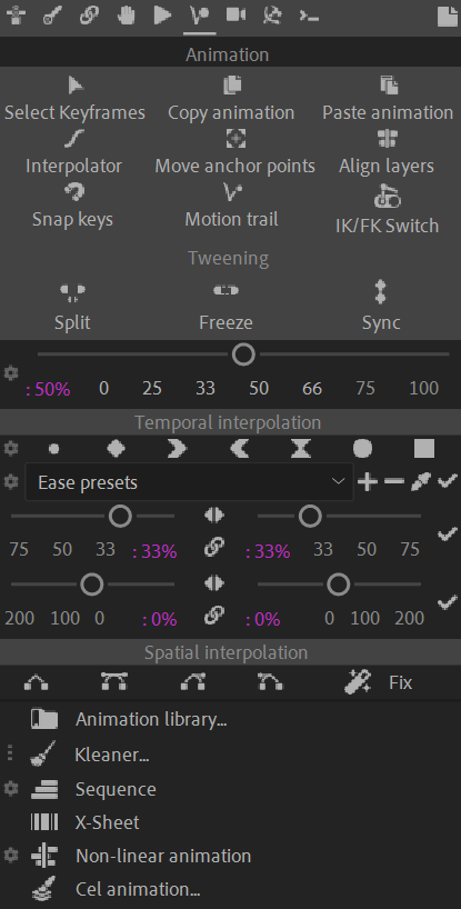 The main tools on the second part of the panel are all the animation tools available in Duik, to keep at hand while you’re struggling with keyframes.