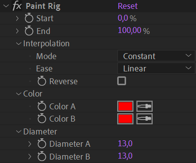 Diameter and Color are divided into two parameters to be able to interpolate from the first stroke to the last one, and act like a ramp through all the strokes.