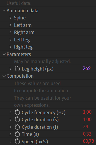 The values exposed in the Animation data section are the actual animation. When setuping the Walk / Run cycle with a custom, non-Duik, rig, you can use the expression pickwhip to these values to apply the animation to specific properties (just add + value; at the end of the expression generated by the pickwhip). The arms animation uses FK, you need to connect them to angle properties. The feet animation uses IK, connect them to position properties.
