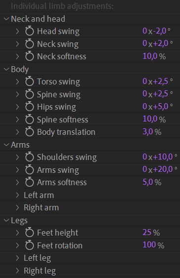 For each limb, you can individually tweak each and every single part of the animation! The properties labeled swing control the rotation of the corresponding part, and the softness usually controls the drag and overlapping animation* of the parts.