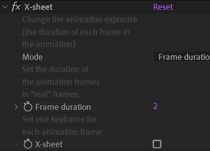 With this mode, you can set, and animate, the Frame duration property, to change the exposure. If you set it to2for example, the property will be animated on twos. This means that each frame of the animation lasts two actual frames of the composition.X-Sheet,Layer markers,Comp markerslet you manuall set the exact time where the frame has to change.