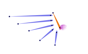 This armature is made of a main bone, which will be animated using its rotation, and fishbones, which add some automatic overlapping animation so the fin bends nicely and smoothly, according to its own flexibility and the resistance of the water. There can be as many secondary fishbones as needed; a single one may be enough for simple fins such as of whales, while complex and flexible fins of tropical fishes may need a few more.