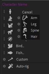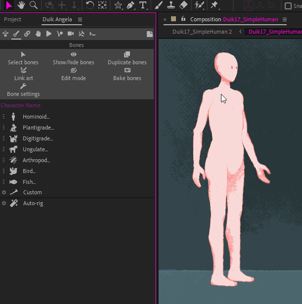 With Duik, you can quickly create all kinds of predefined limbs, or some custom bones if ever the limb you’re rigging is not included in these predefined armatures yet.
