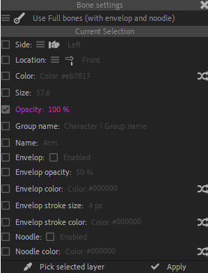 You can use the other bone settings to change the appearance of the selected bones. The Pick selected layer button will pick all values from the selected bone to easily apply the same settings to other bones.
