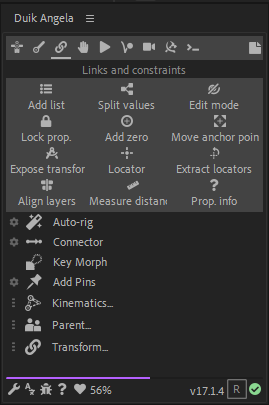 The top toolbar of the Links and Constraints panel contains a few useful tools related to parenting, properties and transformations. Below the toolbar, you’ll find all the available constraints.