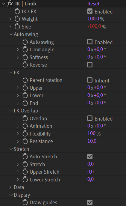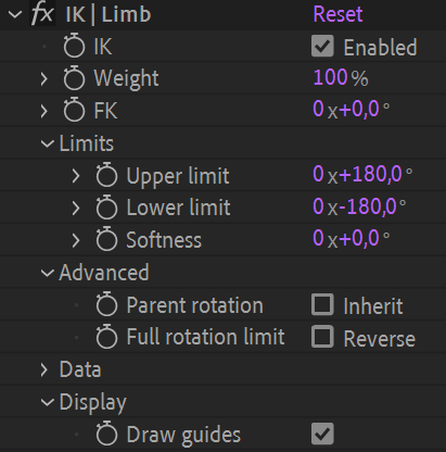 - Draw guides: check this if the controller is a shape layer to show some useful guides to setup the IK. The limits will be shown to help you adjust their values.