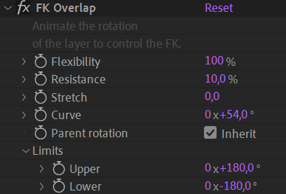 When animating the whole limb at once with a single value, Duik can automatically handle the detailed animation for you, with an automatic overlapping animation, completely customizable.