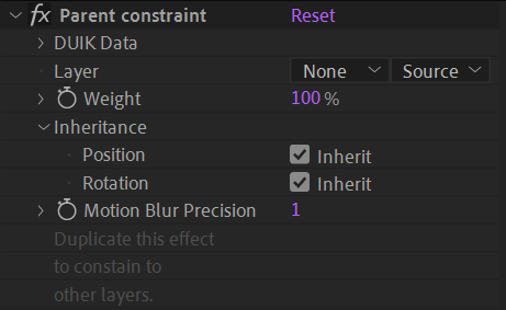 The Parent Constraint works like standard After Effects parenting, except that the parenting can be animated, so that a child layer can change its parent (or combine multiple parents) at any time. This is very useful to temporarilly parent an object to the hand of a character for example.