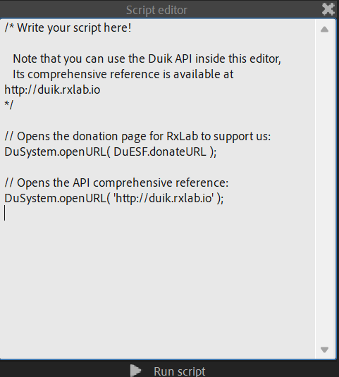 From this editor, the complete Duik API is already included and can be used to automate tasks even more easily.