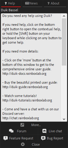 If you need help, click on the bottom right button in Duik to open the contextual help, or hold the Shift button on your keyboard while clicking on any button to get some help.