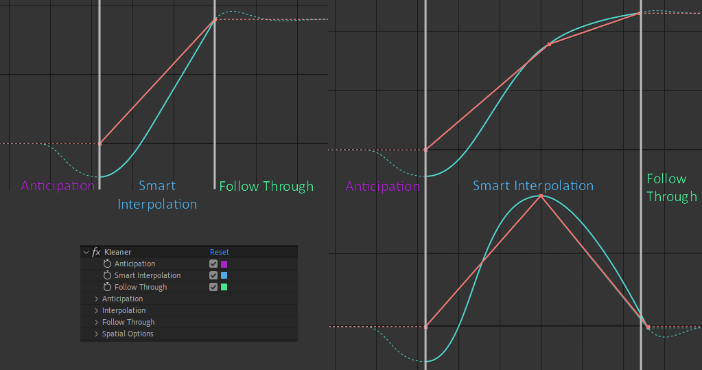 With the kleaner, you don’t have to work on keyframes interpolations anymore, and you don’t even have to animate anticipations and follow-through by hand. You just have to add some keyframes, keep them linear, and tweak the settings of the kleaner, which will automatically generate all of these for you.